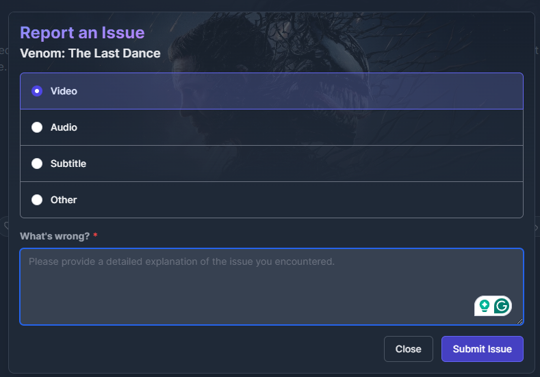 Via Plex this will depend on if you’re using the web app, TV or phone but there should be a report issue button similar to https://overseerr.kerway.co.uk/